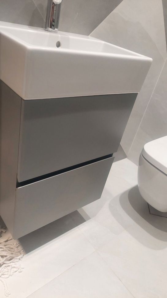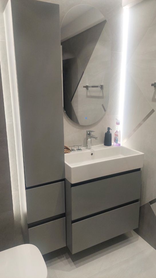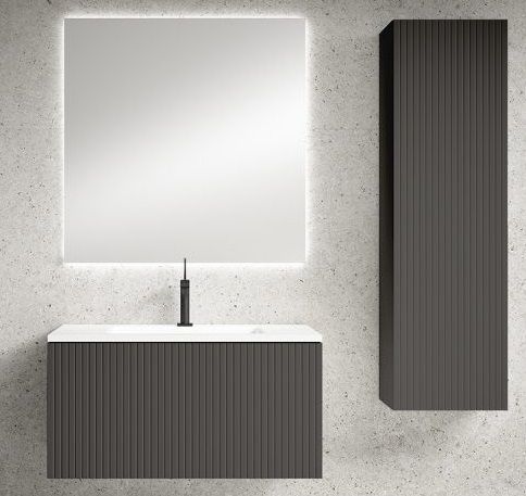 Мебелът е разработен за стенен монтаж като големината и вида на умивалника определят и местоположението на смесителя. Изработва се също с размери и умивалник на клиента, като е възможен и компактен модел, при който дълбочината на плота под 40 см. Мебелът е в комбинация от две чекмеджета, а до него е монтирана колона в същия цвят и разпределение на вратите и коша за пране както при модула с умивалника.