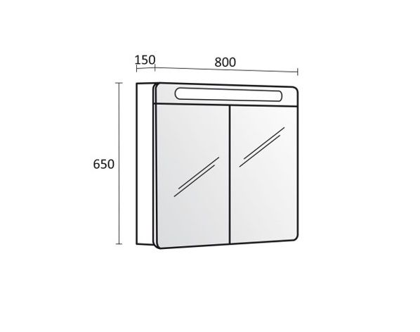Практичен горен шкаф за баня с LED осветление. Две врати с огледало и три стъклени рафта, които функционално разпределят пространството за козметика и тоалетни принадлежности. Три стъклени рафта Две врати Плавно затваряне Панти хром-никел LED вградено осветление Вградено ел.ключе за осветление Захранване 220V Неутрална светлина 4000-4200К Размери в мм: Ш – 800 В – 650 Д – 150