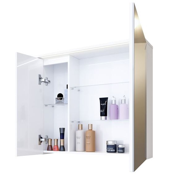 Горен шкаф за баня с две врати и огледало бял гланц от серията Сънлайт на българския производител TRIANO с LED вградено осветление